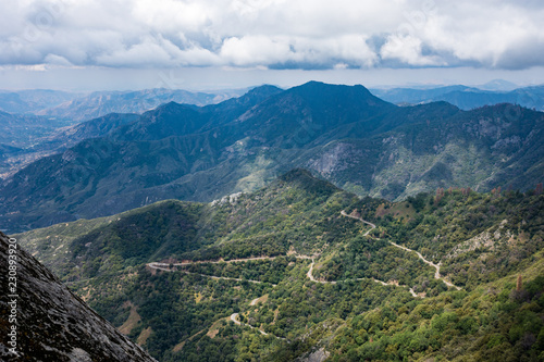 View of the valley in Sequoia National Park in California from the Moro Rock summit hiking trail. Winding twisty mountain road below