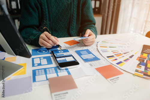 View of UI developer team brainstorming on their project with laptop, smartphone and digital tablet. Creative digital development agency..