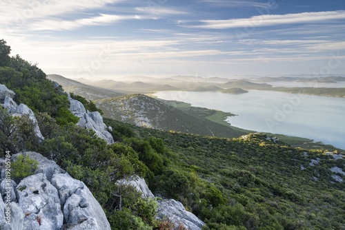 View of Vrana Lake and the coast with islands behind it, Vransko Lake nature park Park, Dalmatia, Croatia