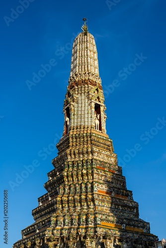 View of Wat Arun temple in Thailand showcasing intricate details against a clear blue sky