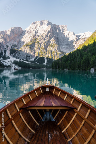 View of wooden boat on Lake di Braies with beautiful mountains in the background, Dolomites. Italy