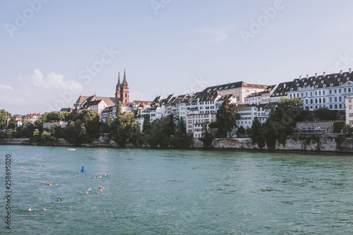View on Basel city and river Rhine, Switzerland. People swim in water