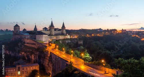 View on the castle in Kamianets-Podilskyi in the evening. Ukraine