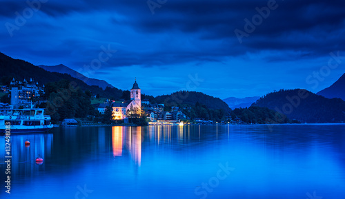 View on the lakefront of the city of St. Wolfgang, Austria in blue hour