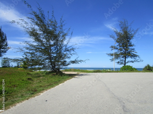 view out to sea from a paved parking area