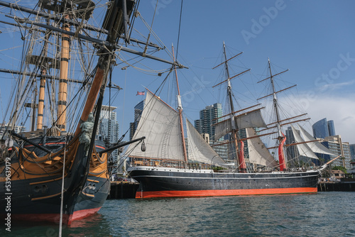 View over downtown port harbor with historic windjammer sailing boats and modern San Diego skyscraper skyline on sunny day