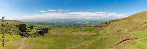 View over the Shropshire landscape from Titterstone Clee near Cleeton, England, UK - with ruins of old Quarry buildings