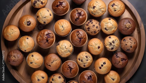 View ro above of a variety of muffins on a wooden plate, chocolate chips, chocolate, cocoa, vanilla, nuts ones