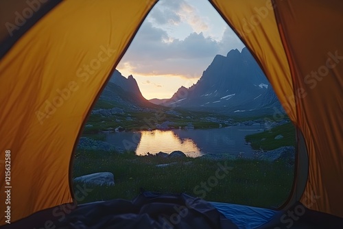 View through a tent opening showing a tranquil mountain valley at sunrise.