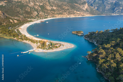 view to curved shape of sandbar and forests on cliff in Turkey