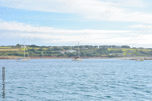 View to pier and coast, dramatic sky, isles of Scilly, United Kingdom