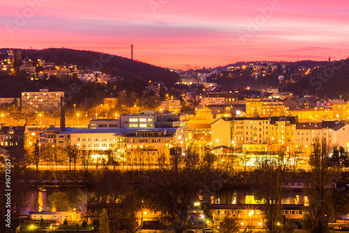 View to the night small district in big city Prague at blue hour, Czech Republic.