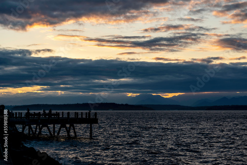 View towards the Olympic Mountains across from Alki Beach in West Seattle on a late summer day. There are dramatic clouds over the Sound.