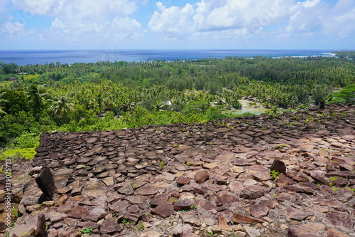 Viewpoint from the marae Paepae Ofata, ancient stone structure, Maeva, Huahine island, French Polynesia, Pacific ocean