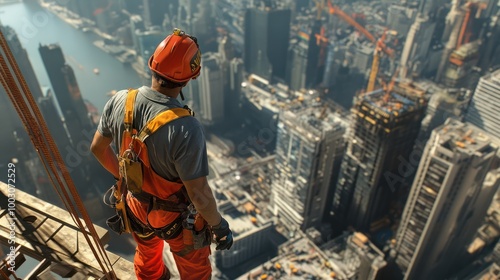 Vigilant worker in safety gear navigating a high-rise construction site, showcasing the challenges and height of their profession