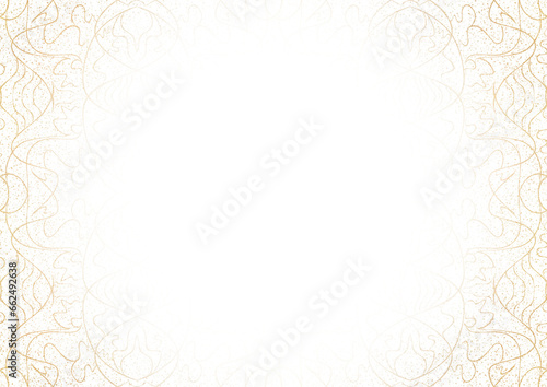 Vignette of golden hand-drawn pattern with splatters of golden glitter isolated on transparent background. Copy space. Digital artwork, A4.. (pattern: p02-1b)