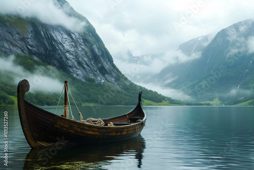 Viking Boat on Misty Lake with Mountain View
