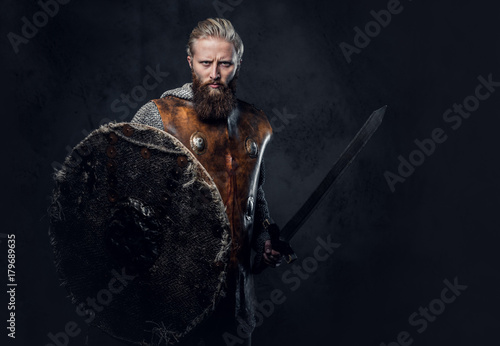 Viking dressed in Nordic armor holds a shield and silver sword.