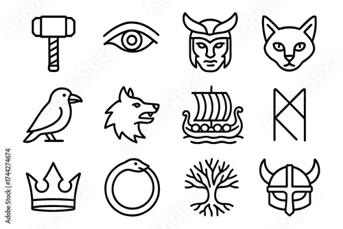 Viking symbols and norse mythology icons in linear style