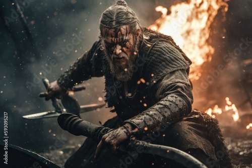 Vikings, Normans warriors and generals fighting on the battlefield, epic battle scene. Generative AI