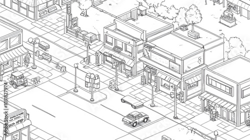 Village Map Coloring Page, intricate layout featuring bank, mart, barber, gas station, hamburger shop, drug store, school, clear black and white design