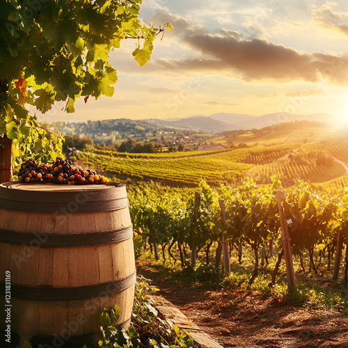 Vineyard at Sunset: A wooden barrel and grapes are in the foreground of a scenic vineyard basking in the golden light of a setting sun.