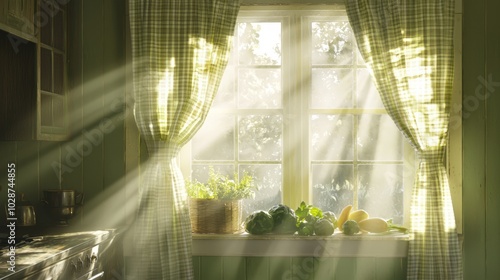 Vintage American Countryside Kitchen with Fresh Garden Produce and Gingham Curtains in Cinematic Light