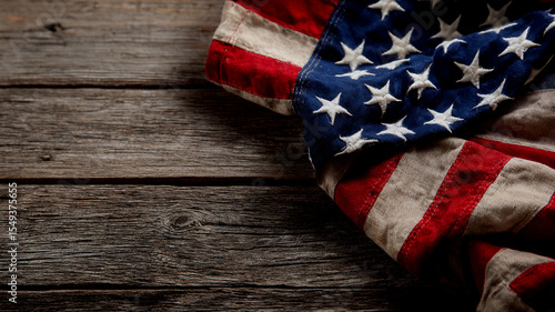 Vintage american flag detail resting on aged wooden background for patriotic themes