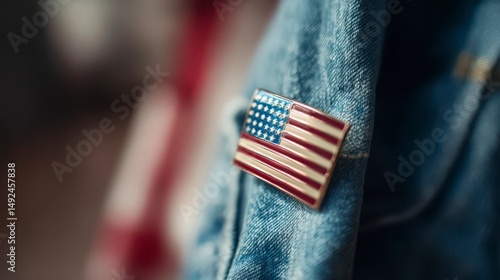 Vintage American flag pin on denim, warm sunlight and blurred stripes, evoking patriotism and nostalgia