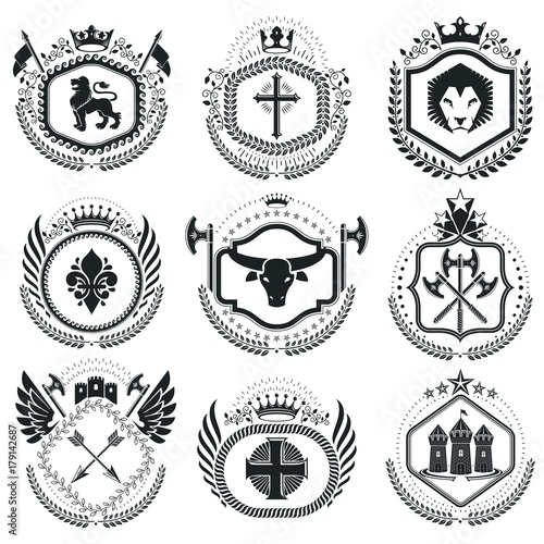 Vintage award designs, vintage heraldic Coat of Arms. Vector emblems. Vintage design elements collection.