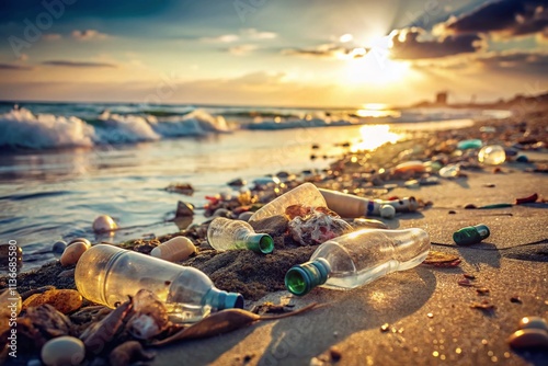 Vintage Beach Pollution: Plastic Bottles, Dirty Shore, Ocean Waste