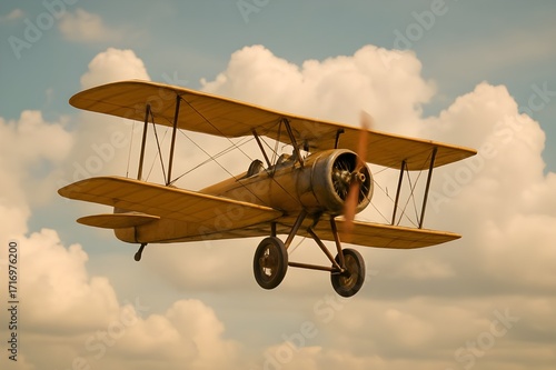 Vintage Biplane Soaring Through a Cloudy Sky
