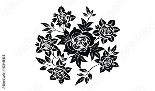 Vintage black and white floral arrangement of roses and leaves
