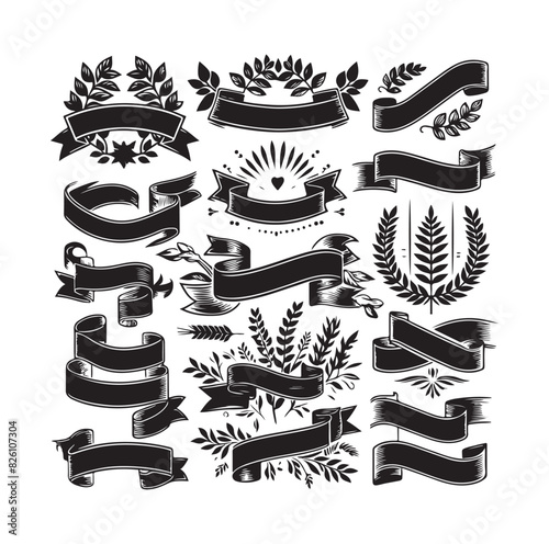 Vintage blank ribbons set. Badge, banner, ribbon, flag, sunburst design element. illustration.