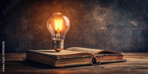 Vintage book next to glowing light bulb on dark background, antique, literature, knowledge, enlightenment