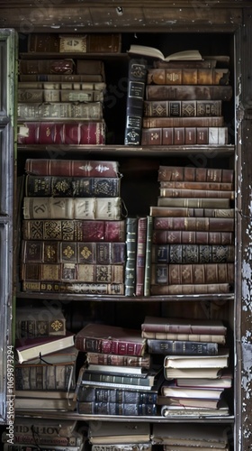Vintage Bookcase Filled with Antique Leather Bound Books - A Library of Knowledge and History