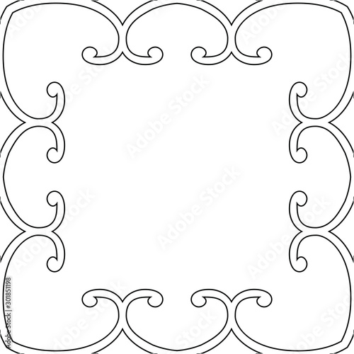 Vintage border frame, thin curved lines, linear vintage pattern, black and white vector illustration.