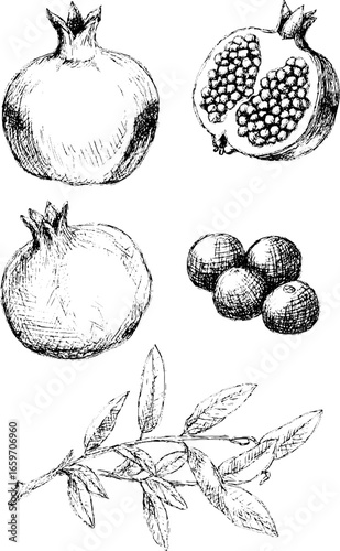 Vintage botanical drawing of pomegranates, oranges, and leaves