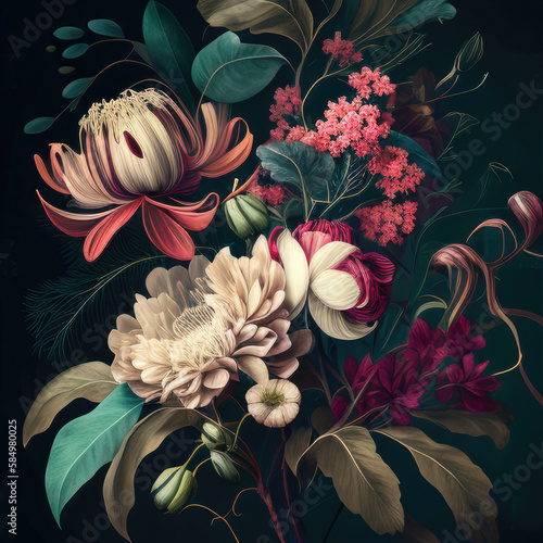 Vintage bouquet of beautiful flowers. Floral botanical background. Created with Generative AI.