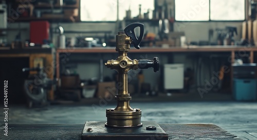Vintage Brass Bicycle Pump in a Busy Workshop Setting, Detailed and Elegant Design