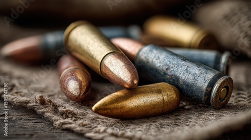 Vintage bullets and shell casings arranged on military-style cloth, historical reenactment theme