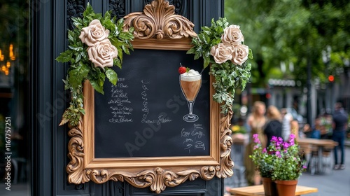 Vintage Cafe Menu Board with Handwritten Items and Decorative Floral Frame Set Against a Lively Outdoor Dining Scene