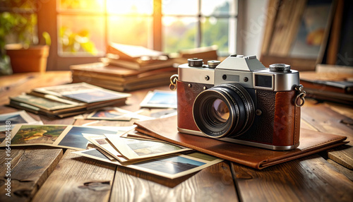 Vintage camera and cherished photos evoke nostalgia and timeless memories on a rustic wooden surface.