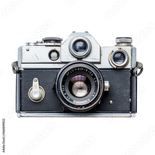 Vintage camera, front view. Antique photographic tool