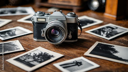 Vintage Camera Surrounded by Black and White Photographs Memories