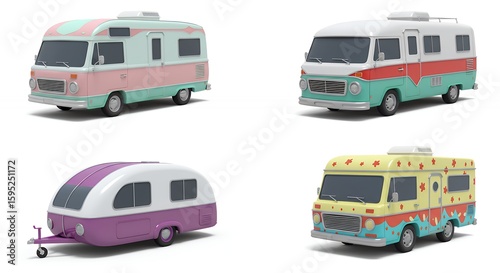 Vintage camper vans and trailers on white background