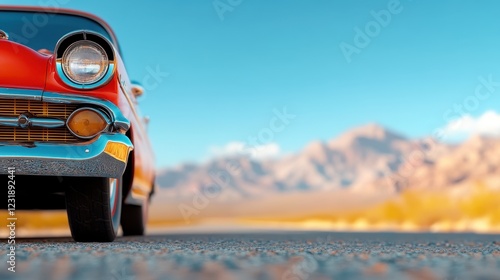 Vintage car cruising along a lonely desert road under a bright blue sky