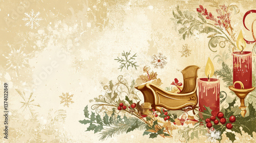 Vintage Christmas Background with Sleigh, Candles, and Holly Decor