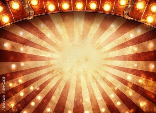 vintage circus poster background with retro marquee lights and sunburst rays, warm nostalgic tones, empty space for text or banner design