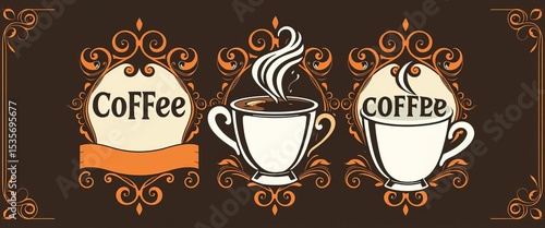 Vintage coffee cup emblems, ornate swirls, retro style takeaway coffee labels, mocha, hot